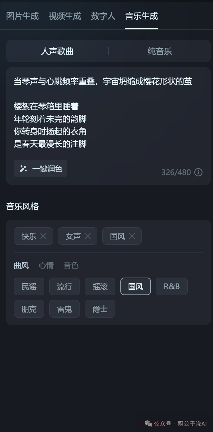 然后我们回到即梦,选择 “音乐生成” 下的“人声歌曲”,将DeepSeek给的歌词复制粘贴,当然, 要记得把那些段落名给去掉。