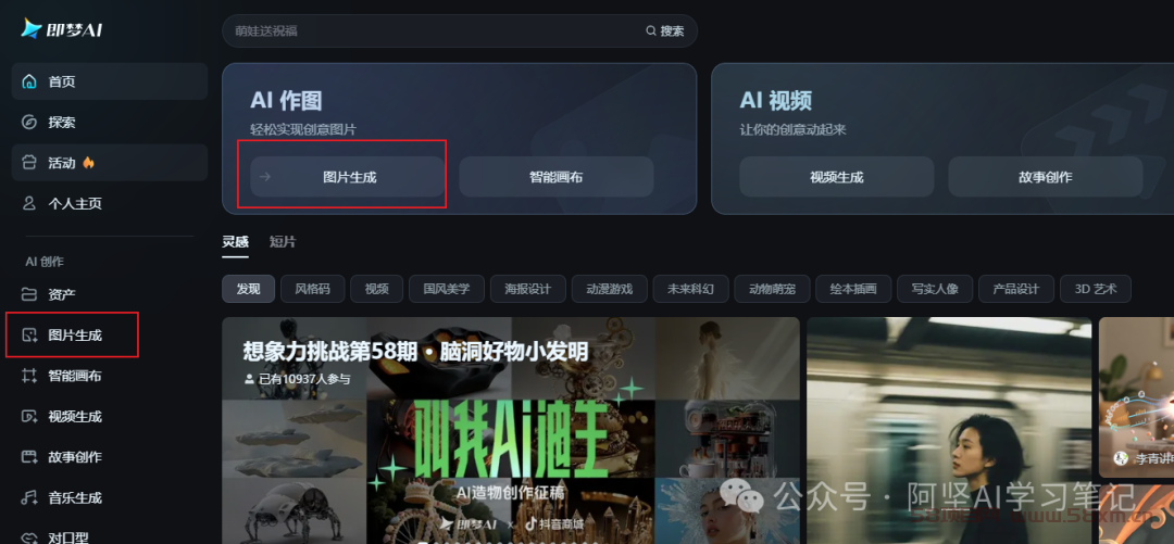 打开即梦,选择图片生成(每天登录都有66-100积分送,相当于免费用,对于新手足够用)。