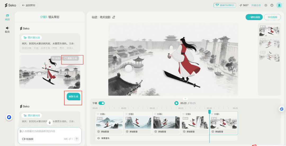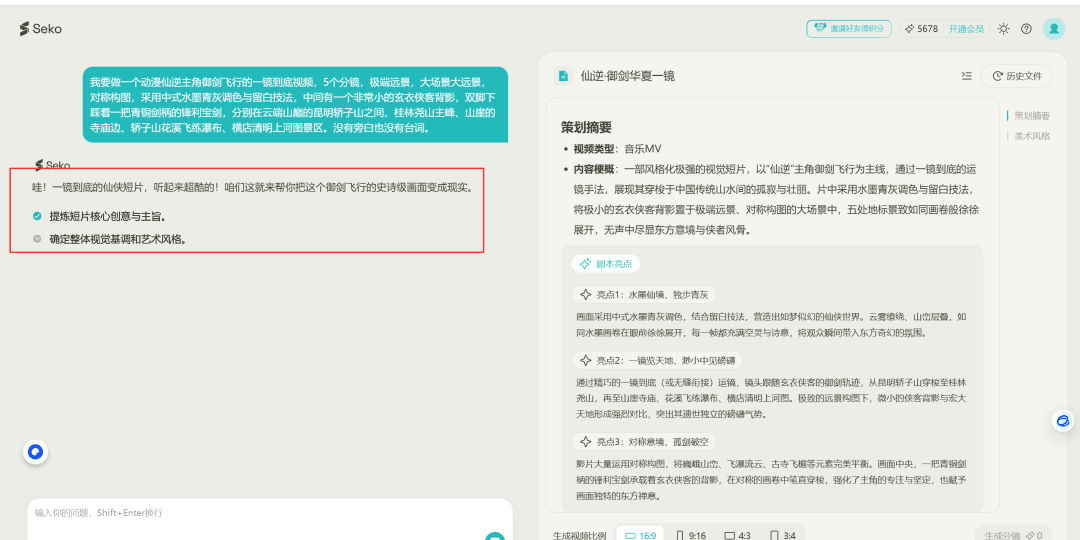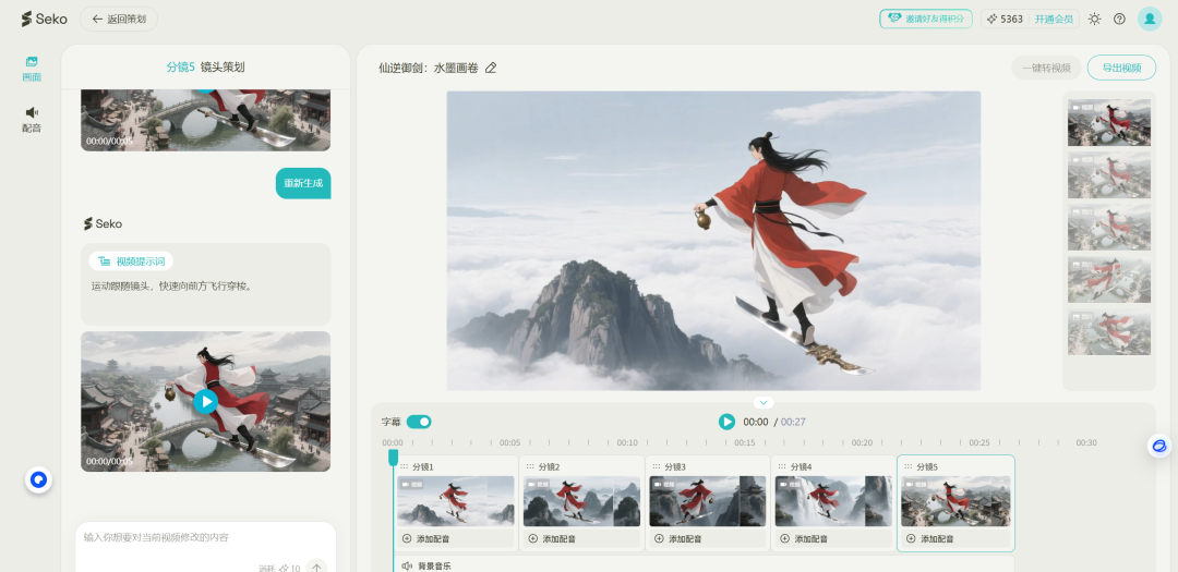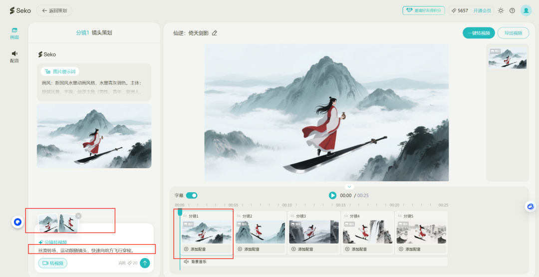 先看一下我的作品:实战教程1.打开seko工作台网址:https://seko.sensetime.com/invite/VXYIZZSB输入提示词:我要做一个动漫仙逆主角御剑飞行的一镜到底视频,5个分镜,极端远景,大场景大远景,对称构图,采用中式水墨青灰调色与留白技法,中间有一个非常小的玄衣侠客背影,双脚下踩着一把青铜剑柄的锋利宝剑,分别在云端山巅的昆明轿子山之间、桂林尧山主峰、山崖的寺庙边、轿子山花溪飞练瀑布、横店清明上河图景区。没有旁白也没有台词。