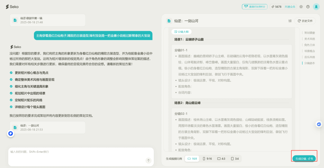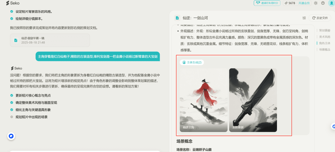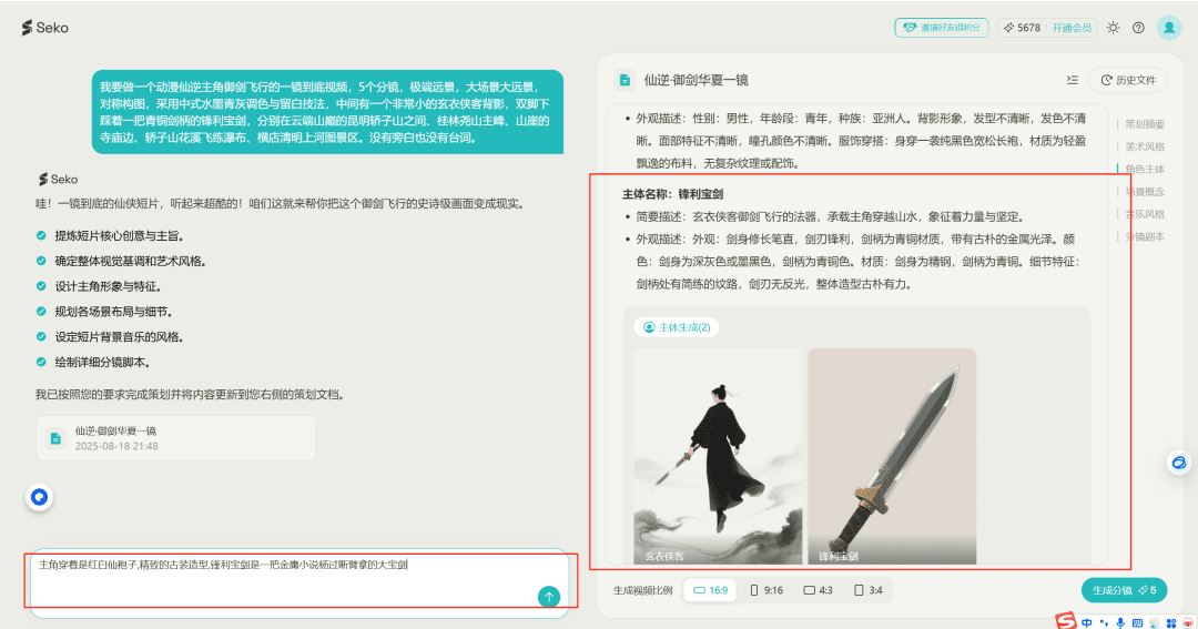seko会设计好短片的主体,不符合预期可以输入提示词:主角穿着是红白仙袍子,精致的古装造型,锋利宝剑是一把金庸小说杨过断臂拿的大宝剑
