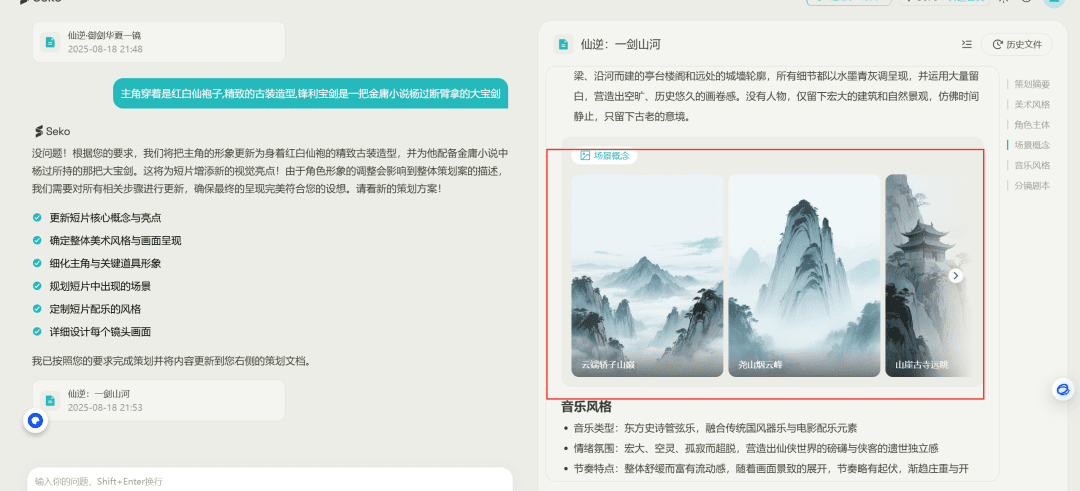 点击发送,seko会设计一个符合仙侠短片的风格和主题