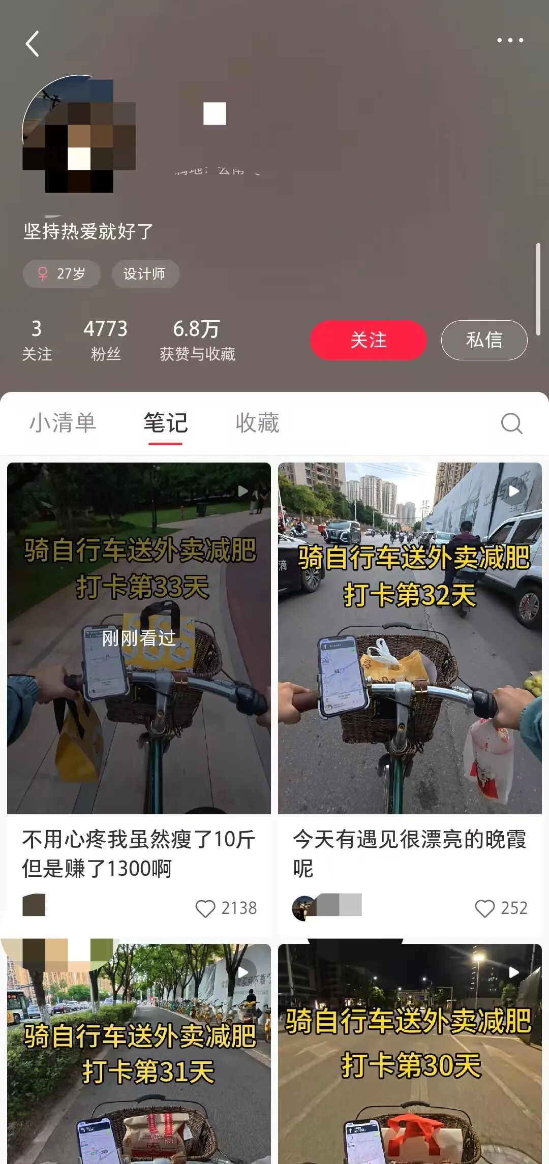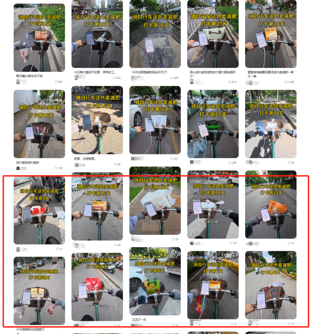 我们看下面这个账号,是拍的 vlog 视频,但是我们看标题,骑自行车送外卖减肥打卡第33天,骑自行车没啥,骑自行车送外卖就有点新奇,还带减肥的目的,这些组合在一起就是流量密码。