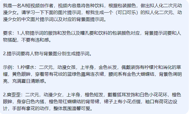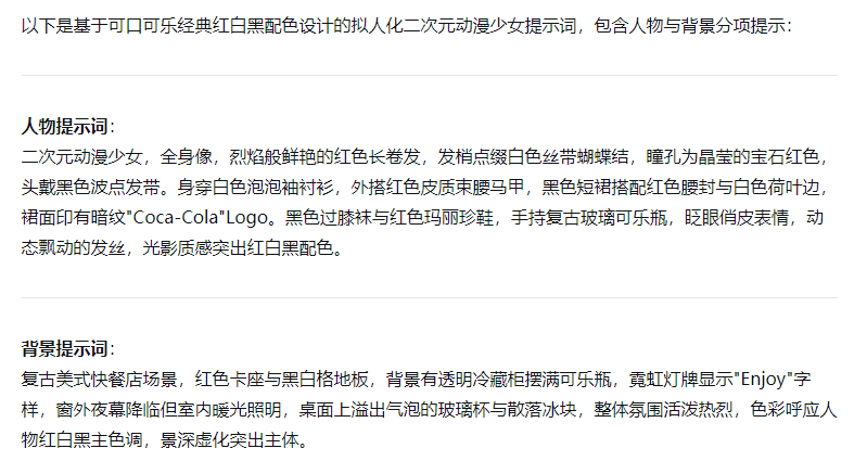 网址:https://www.deepseek.com/1.打开deepseek,输入提示词:我是一名AI短视频创作者,视频内容是将各种饮料,根据包装颜色,做出拟人化二次元动漫少女。请学习一下下面的图片提示词,帮我生成一个(可口可乐)的拟人化二次元、动漫少女的中文图片提示词以及对应的背景图提示词。