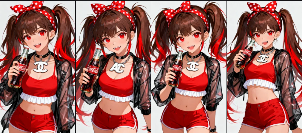人物提示词:二次元动漫少女,全身像,烈焰般鲜艳的红色长卷发,发梢点缀白色丝带蝴蝶结,瞳孔为晶莹的宝石红色,头戴黑色波点发带。身穿白色泡泡袖衬衫,外搭红色皮质束腰马甲,黑色短裙搭配红色腰封与白色荷叶边,裙面印有暗纹”Coca-Cola”Logo。黑色过膝袜与红色玛丽珍鞋,手持复古玻璃可乐瓶,眨眼俏皮表情,动态飘动的发丝,光影质感突出红白黑配色。