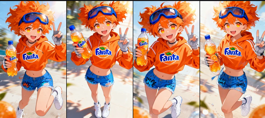 要求:1.人物提示词的服饰和发色以及瞳孔要和饮料的包装颜色对应,背景提示词要和人物搭配,不要有违和感。