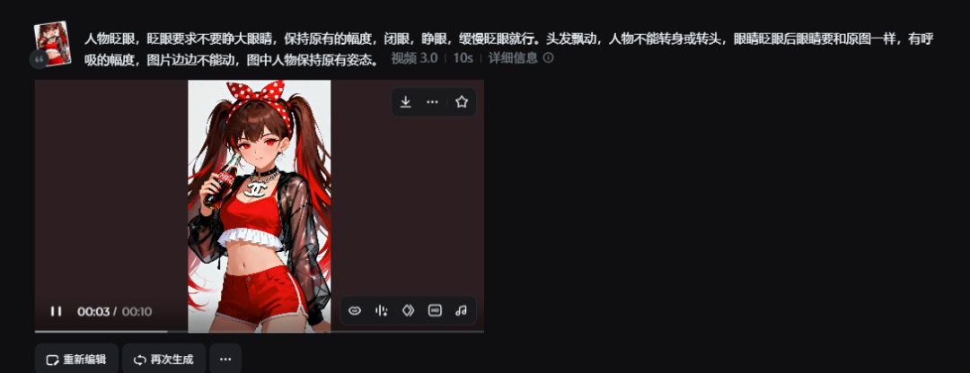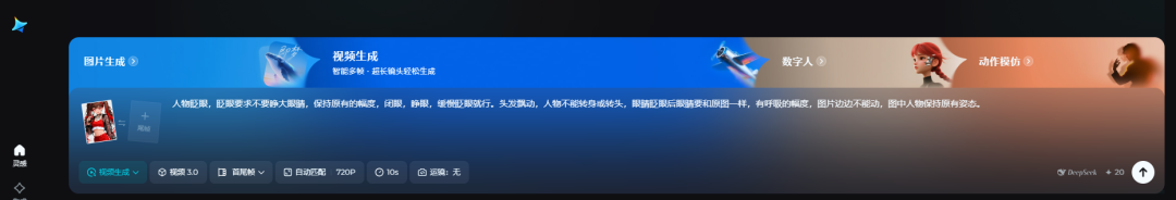 1.回到即梦首页,切到 “视频生成”,上传刚做好的人物图;输提示词(按自己想要的动作改就行):人物眨眼(别睁大眼睛,保持原幅度,缓慢闭眼再睁眼),头发轻轻飘动,别转身转头,眨眼后眼睛和原图一致,有轻微呼吸幅度,图片边缘不动,人物保持原有姿态,时长选 10 秒,点生成。