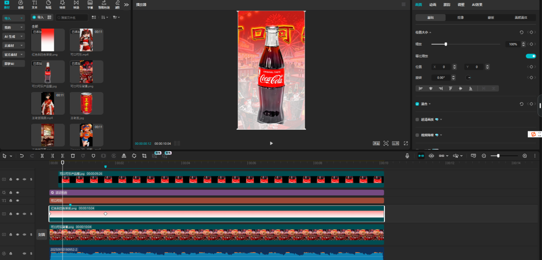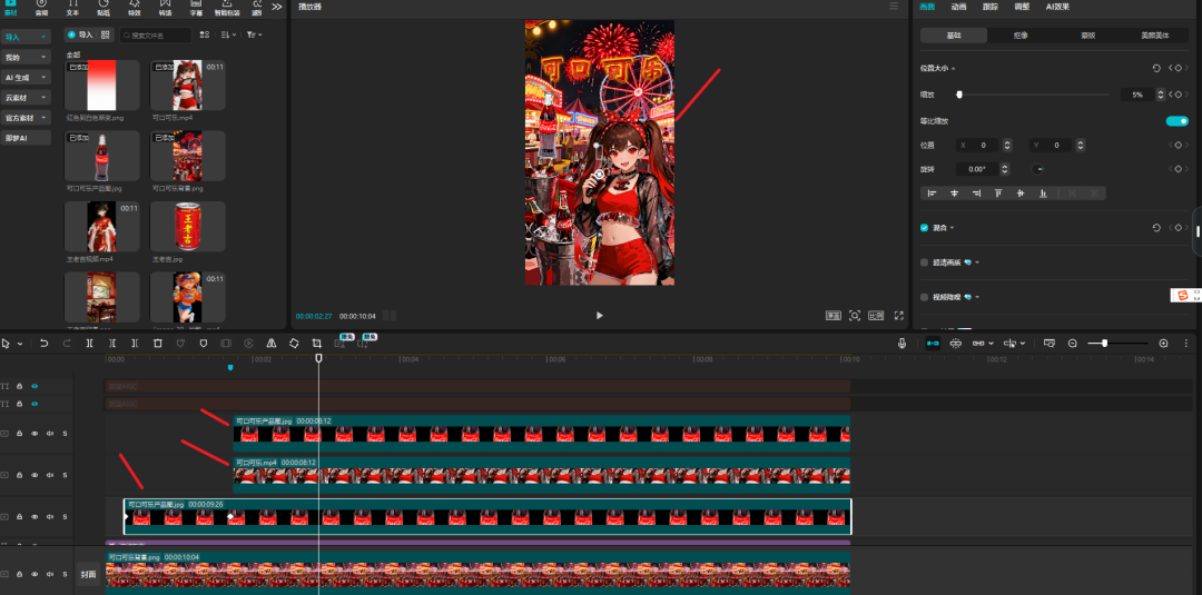 2.再按顺序插入产品图、人物动态图,调整好节奏,最后导出就行。