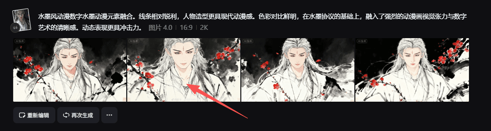 第一步,在网上先找到一个成毅的剧照打开即梦,选择图片生成。输入口令词:水墨风动漫数字水墨动漫元素融合。线条相对锐利,人物造型更具现代动漫感。色彩对比鲜明,在水墨协议的基础上,融入了强烈的动漫画视觉张力与数字艺术的清晰感。动态表现更具冲击力。步骤图如下: