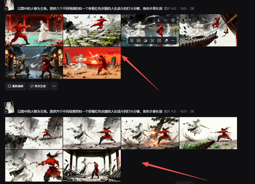 口令词:以图中的人物为主角。提供六个不同场景的和一个穿着红色衣服的人在战斗的打斗分镜,角色手拿长剑(你们可以多生成一些镜头)