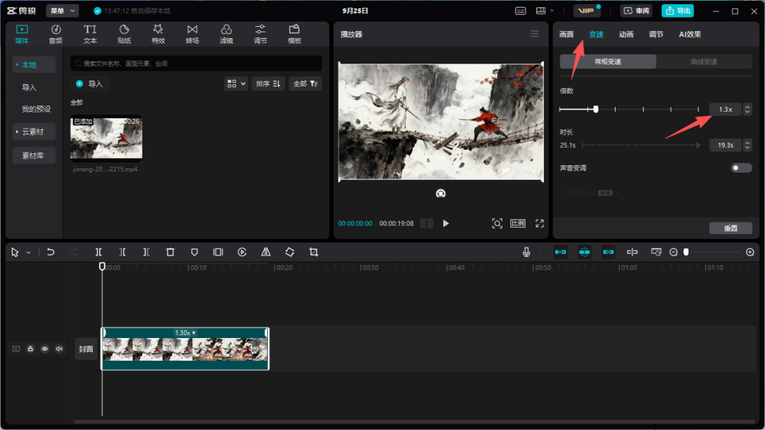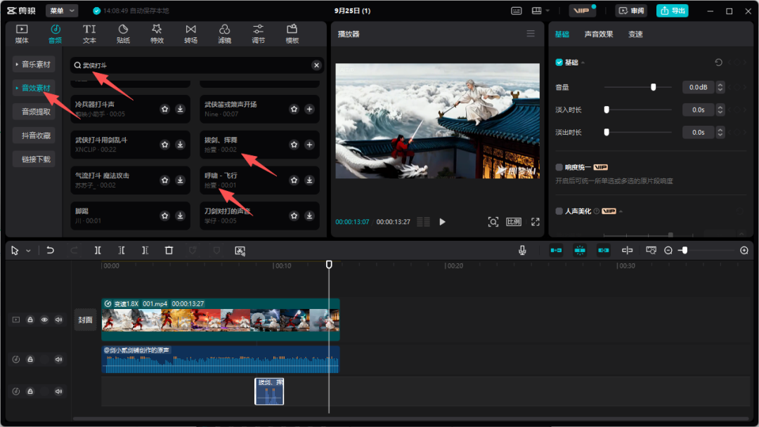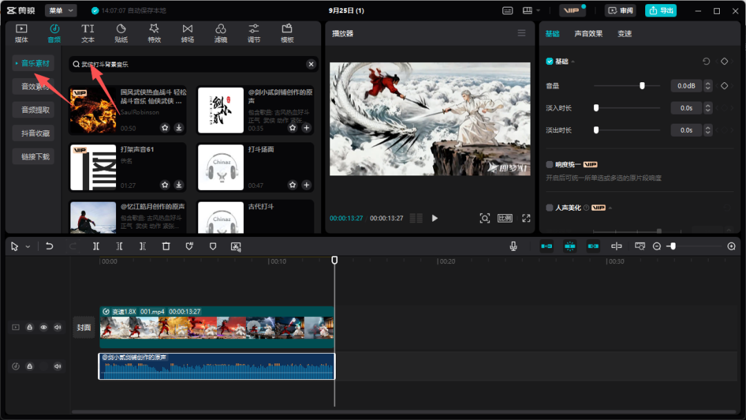 打开剪映,导入图片素材,添加配乐与音效步骤图如下: 如果你觉得视频的动作效果慢的话也可以调一下速度