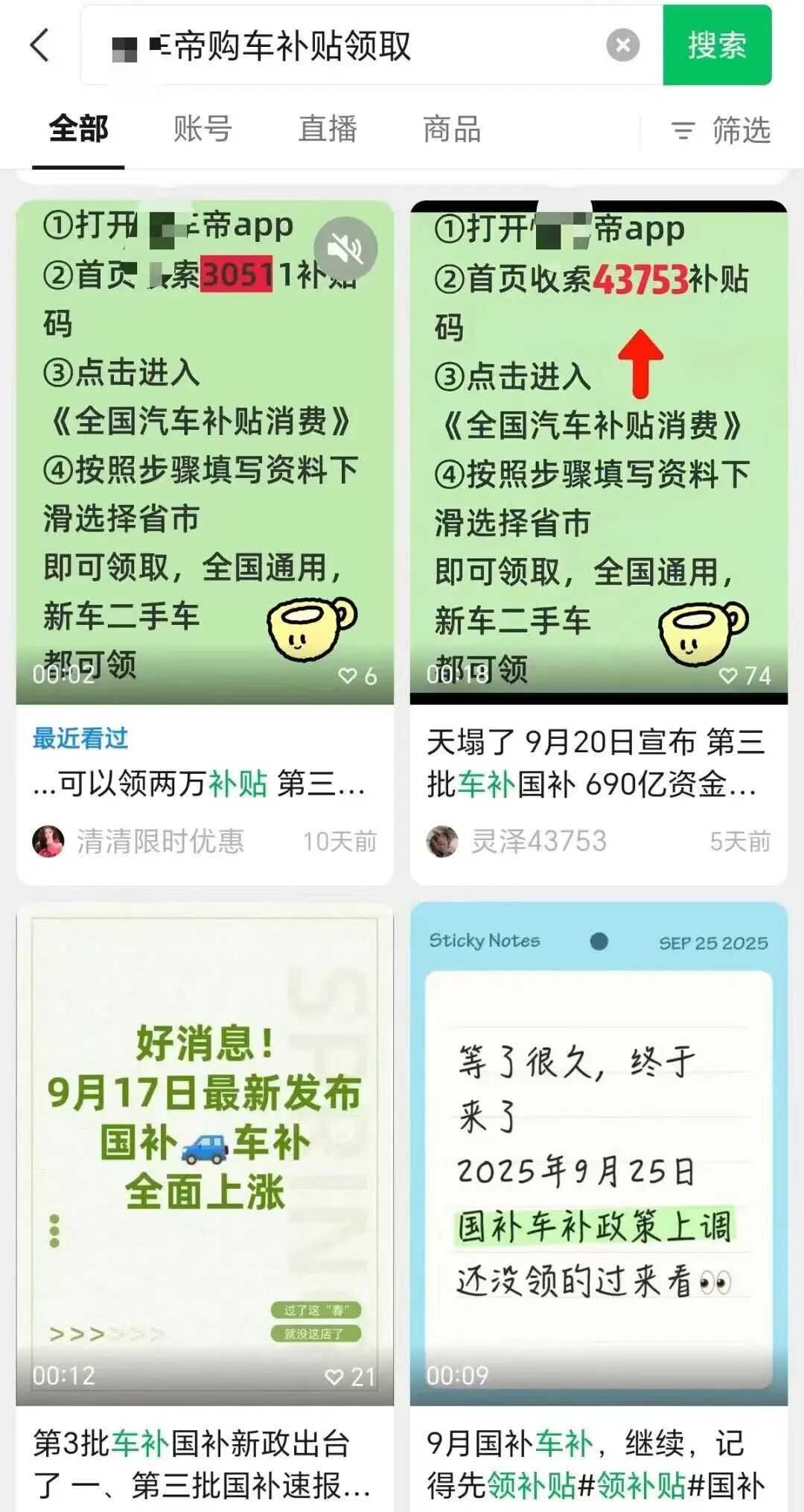 3.寻找对标账号在某音、某手、小红薯等平台搜索“某车帝购车补贴”,会发现大量同类账号: 4.