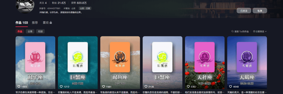 103个作品,粉丝21.6万,获赞820.8万,数据相当不错。