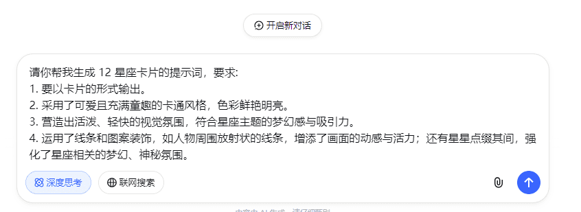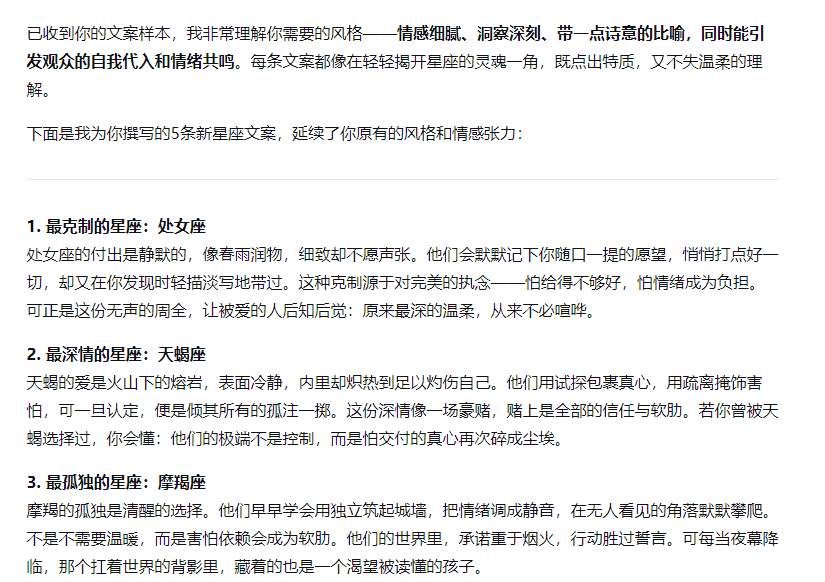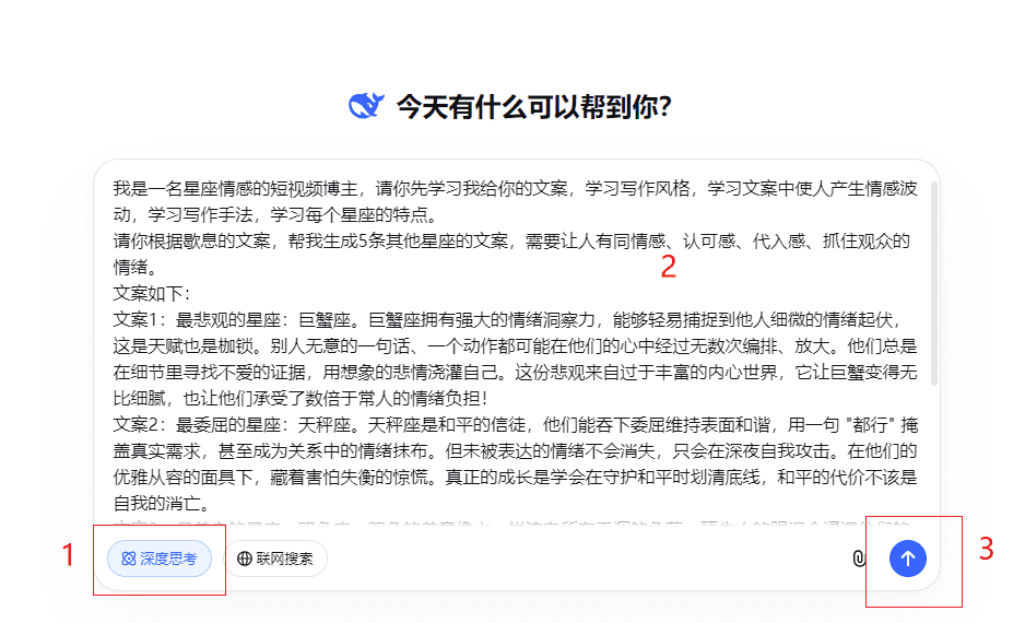1.打开deepseek,输入提示词:我是一名星座情感的短视频博主,请你先学习我给你的文案,学习写作风格,学习文案中使人产生情感波动,学习写作手法,学习每个星座的特点。