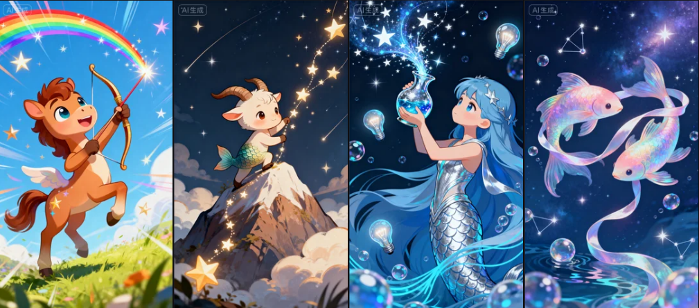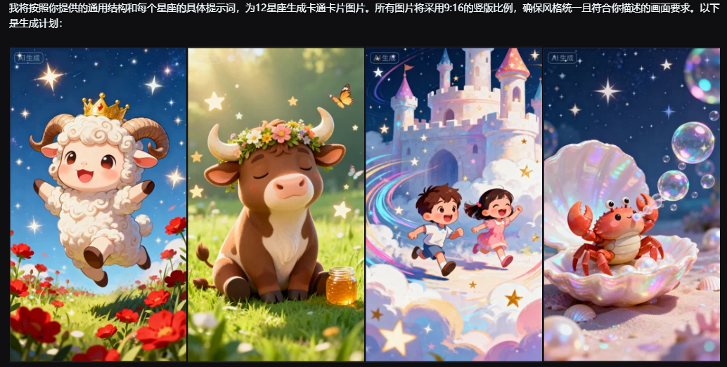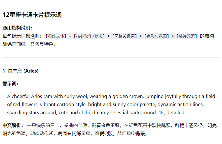 2.接下来生成12星座卡片提示词,继续输入:请你帮我生成 12 星座卡片的提示词,要求:1. 要以卡片的形式输出。2. 采用了可爱且充满童趣的卡通风格,色彩鲜艳明亮。3. 营造出活泼、轻快的视觉氛围,符合星座主题的梦幻感与吸引力。4. 运用了线条和图案装饰,如人物周围放射状的线条,增添了画面的动感与活力;还有星星点缀其间,强化了星座相关的梦幻、神秘氛围。