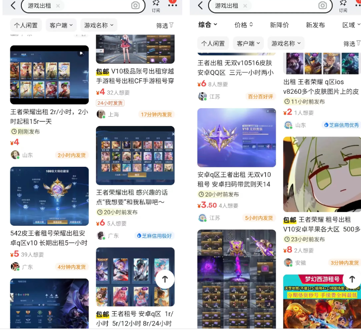 你从转租平台拿货,一小时才花 0.3 块,转手租给玩家就能收 5-10 块,具体看账号价值加价就行。