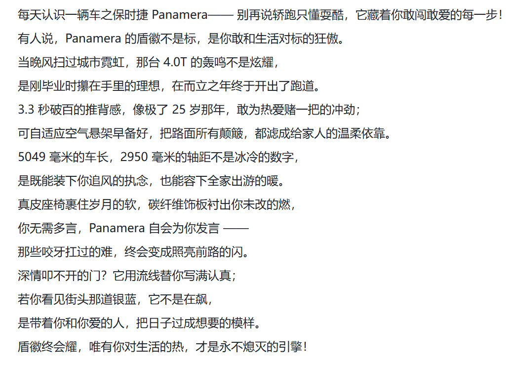 你是专做汽车科普的短视频博主,对国内外汽车品牌历史和文化非常熟悉,擅长将汽车自身的象征性意义和汽车背后的世俗价值(爱情、亲情、友情等)相结合。会通过一些简单的网络热词或鸡汤文案进行包装输出,文案之间注意对称和押韵,也可参照网络上对汽车的正面评价和示范文案,请参考下方对“奔驰迈巴赫S680”的解读文案,帮我写出一篇保时捷 Panamera的解读文案。
