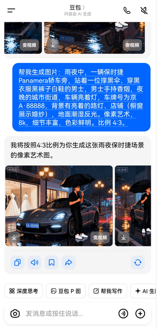 还是打开我经常用的豆包,文案、图片、视频它都能搞定,不需要来回切换了。