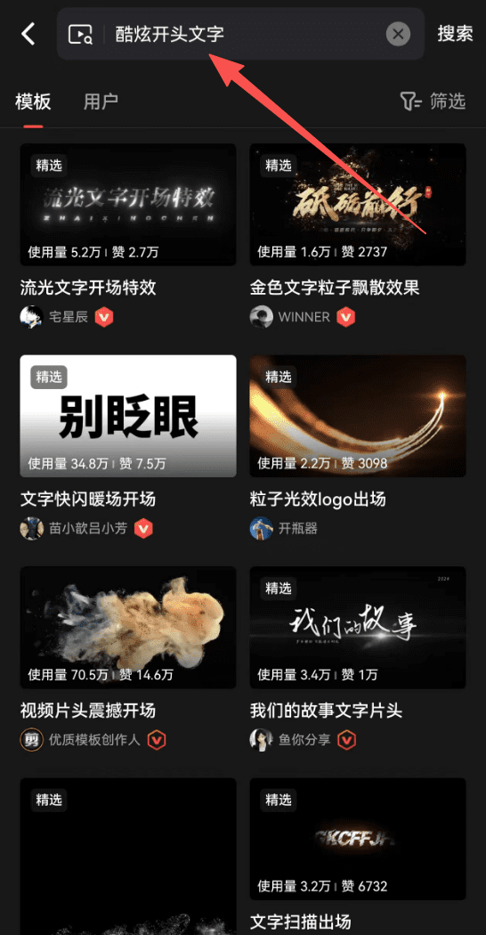 下面一排有个剪同款,搜索“酷炫开头文字”