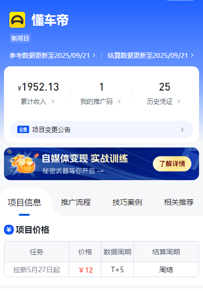 说实话,拉新项目我见多了,但懂车帝这个确实有点东西,单价给到12块,比其他APP拉新高了不少。最关键的是,现在还处于红利期,做的人不算多。