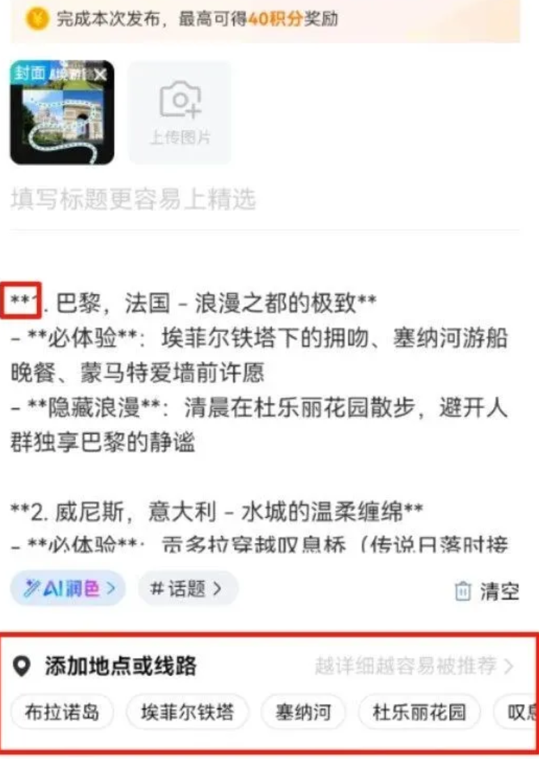 接着发布前检查并删除内容中AI生成自带的星星图标,手动添加地点标签,提升内容曝光度。