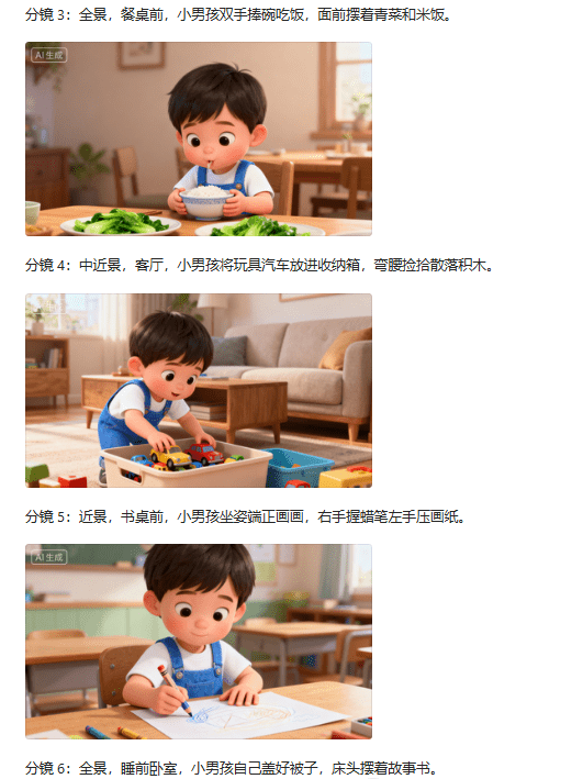 对于这种简单的 AI 短片,分镜图直接这样一键生成也是够用的,基本不用做过多的修改。