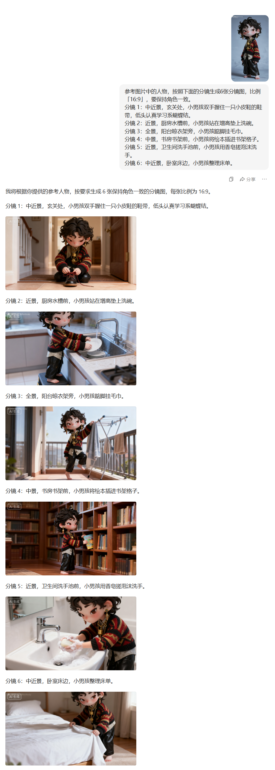 这样我们就得到一组 IP 角色的分镜图,筛选合适的生成视频,个人 IP 短片就有雏形了。