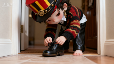 分镜 1:中近景,玄关处,小男孩双手握住一只小皮鞋的鞋带,低头认真学习系蝴蝶结。