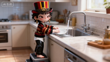 分镜 2:近景,厨房水槽前,小男孩站在增高垫上洗碗。