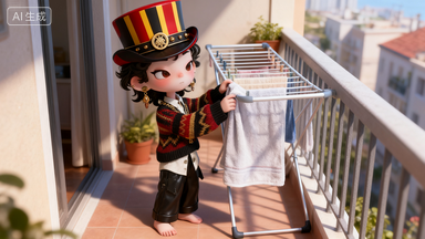 分镜 3:全景,阳台晾衣架旁,小男孩挂毛巾。