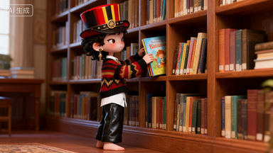 分镜 4:中景,书房书架前,小男孩将绘本插进书架格子。