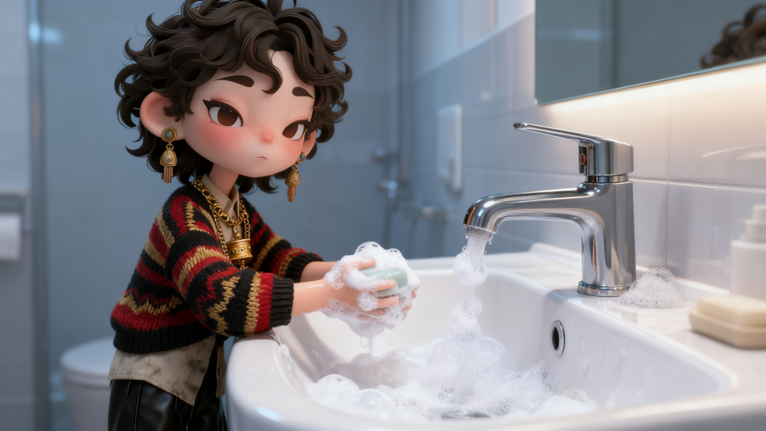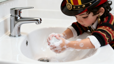 分镜 5:近景,卫生间洗手池前,小男孩用香皂搓泡沫洗手。