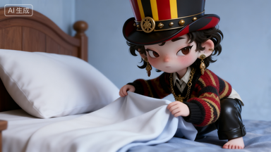 分镜 6:中近景,卧室床边,小男孩整理床单。