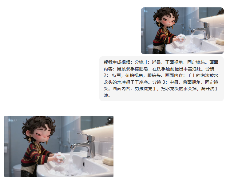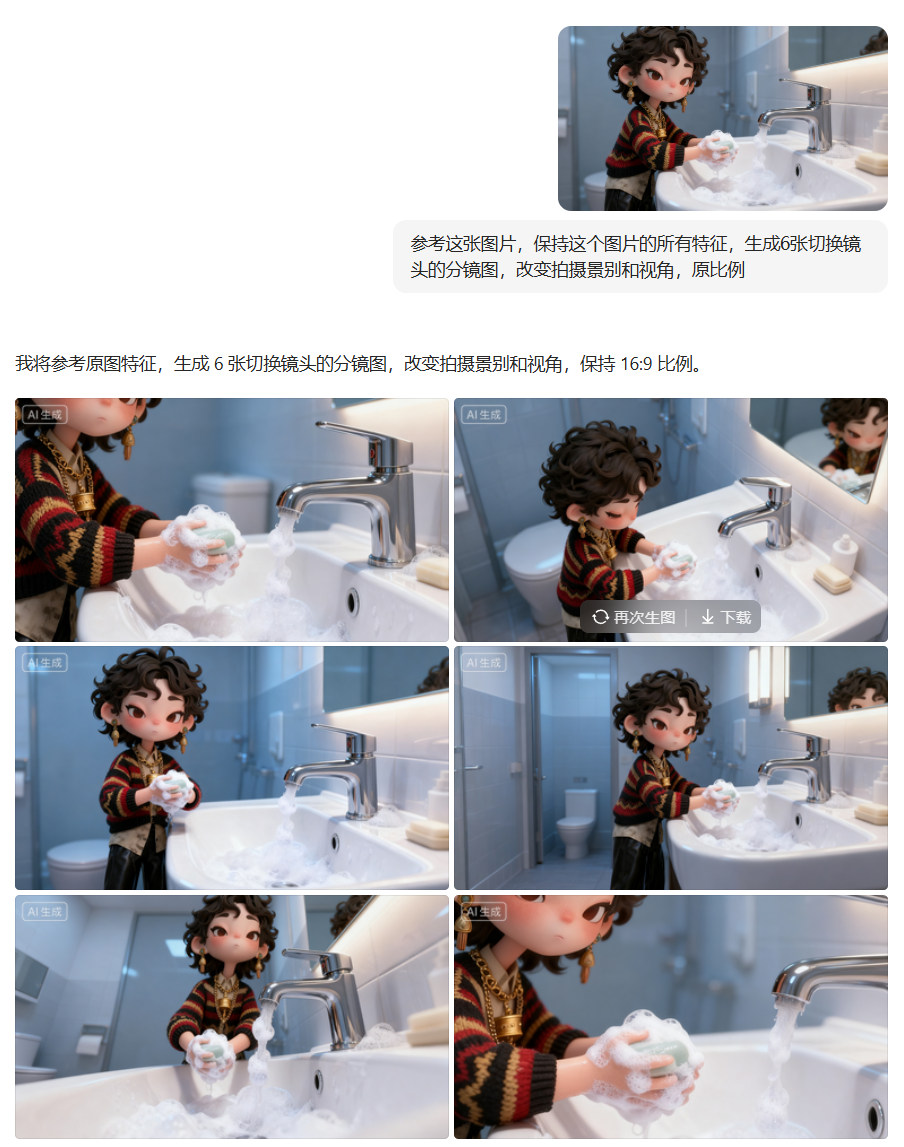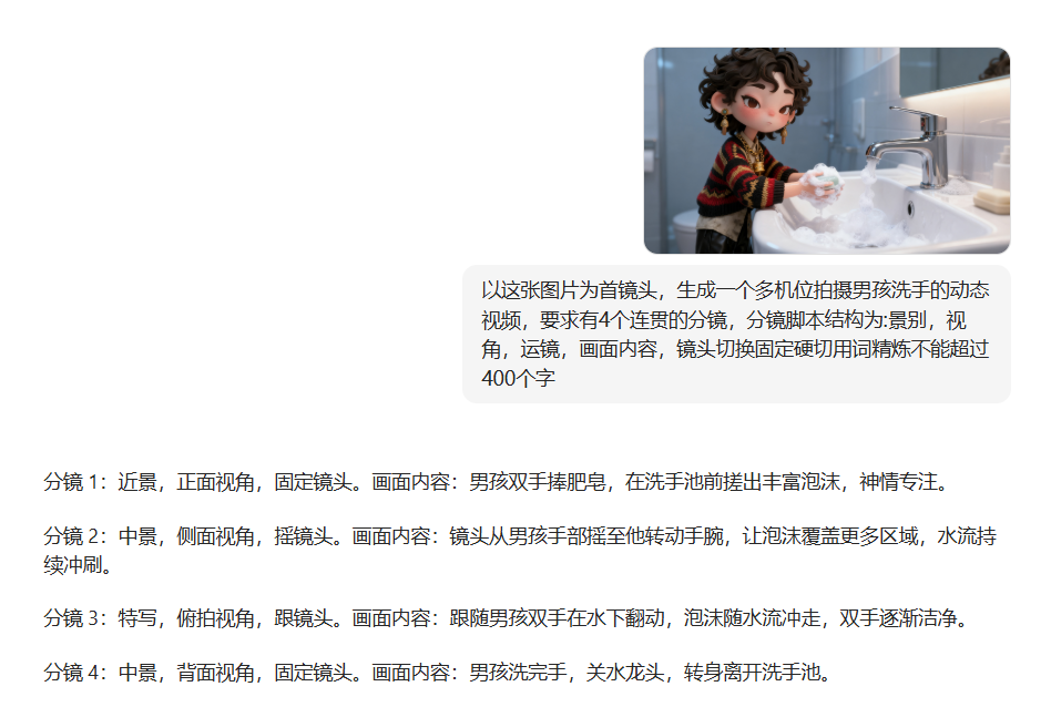 比如下面这张洗手画面图片,要做多视角分镜,提示词可以这样: