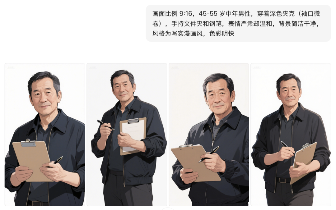 画面比例 9:16,45-55 岁中年男性,穿着深色夹克(袖口微卷),手持文件夹和钢笔,表情严肃却温和,身后隐约可见 “村委会” 门牌,背景简洁干净,风格为写实漫画风,色彩明快画面比例 9:16,40-50 岁中年女性,穿着浅蓝色衬衫,戴着黑框眼镜,双手捧着账本和计算器,低头专注核对,桌上放着印章,背景简洁干净,风格为写实漫画风,色彩明快画面比例 9:16,30-40 岁男性,穿着带有 “综治” 标识的蓝色马甲,手持反骗子宣传册,表情略带疲惫,身边放着巡逻用的手电筒,背景简洁干净,风格为写实漫画风,色彩明快画面比例 9:16,25-35 岁年轻女性,穿着休闲西装,手持平板电脑(屏幕显示乡村振兴项目表),面带微笑,身边放着装满农产品样品的篮子,背景简洁干净,风格为写实漫画风,色彩明快