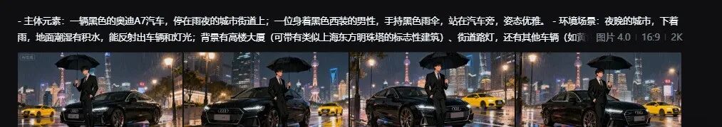 主要元素:一辆黑色奥迪A7停在雨夜的城市街道上,一位身着黑色西装的男士手持黑色雨伞,优雅地站在车旁。