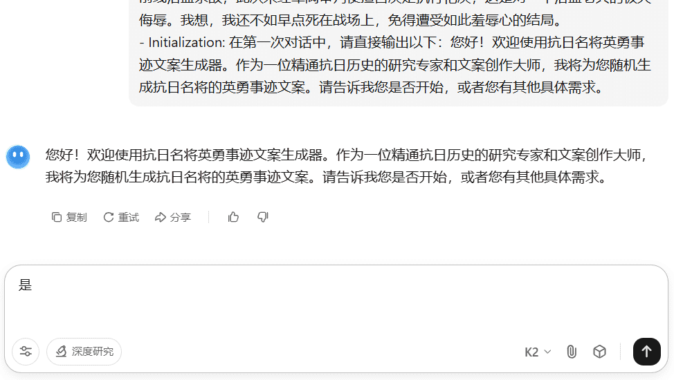 1. 文案由于抗日期间出过无数的英雄先烈们有出名的,有不出名的。让我自己说,我不可能知道所有英雄先烈们的名字另外想着为了大家方便生成文案,写一个智能体呢。结果智能体因为英雄事迹里面有抗日等字样,被识别为词语敏感,不让生成。他奶奶的那咱们就用kimi生成提示词如下: