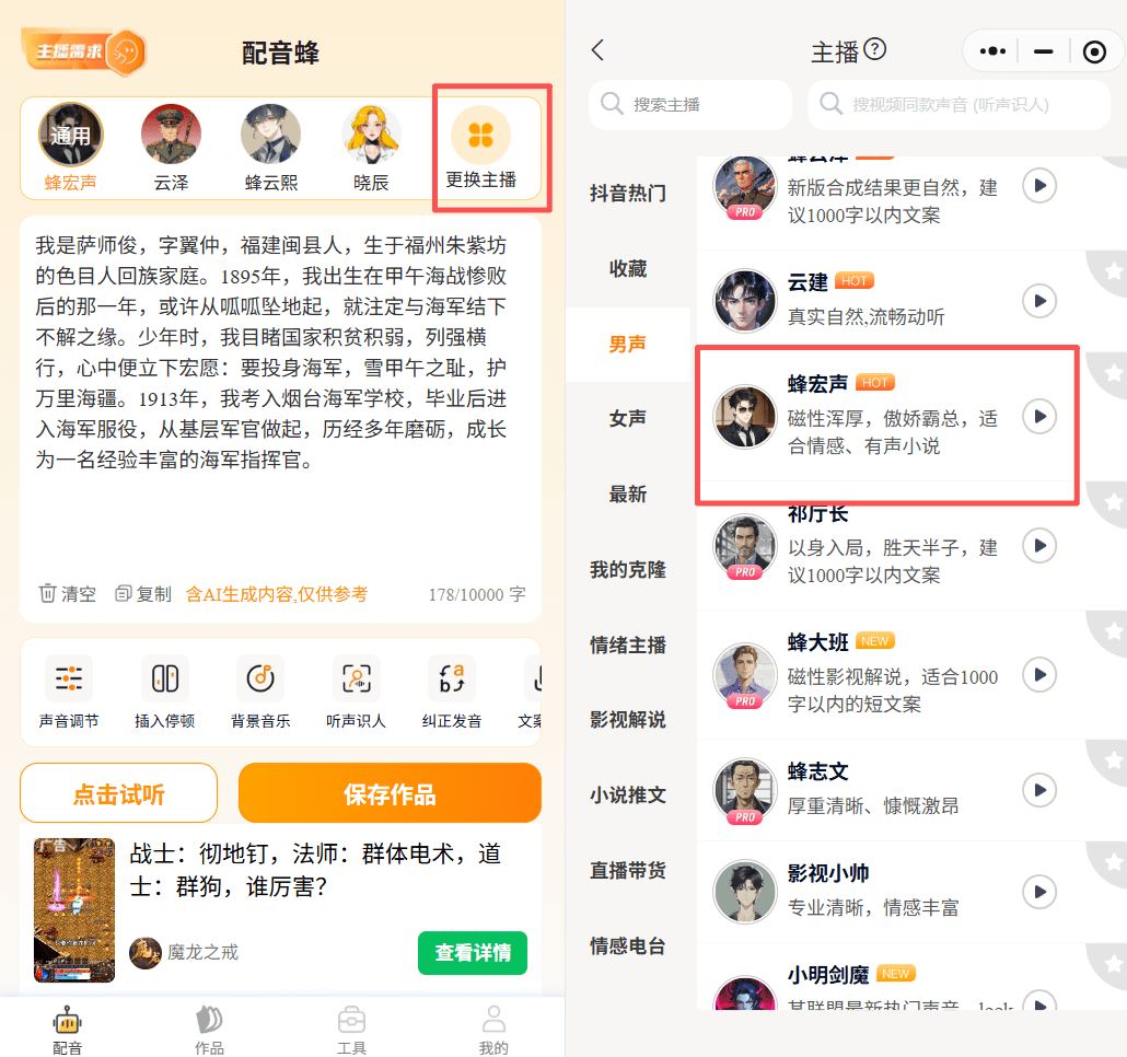 2. 配音配音软件还是很多的比如微信小程序:配音神器,配音蜂,皮皮配音等用配音蜂延时吧,主要是这个配音软件1天看5个广告就可以无限免费用了将文案复制进来,选一个合适的声音主播