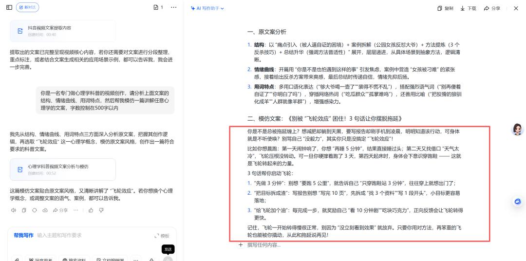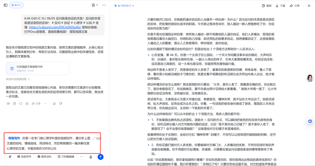 豆包会帮我们提取到文案,输入提示词:你是一名专门做心理学科普的视频创作,请分析上面文案的结构、情绪曲线、用词特点,然后帮我模仿一篇讲解任意心理学的文案,字数控制在500字以内