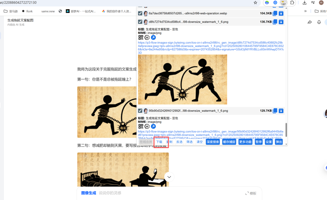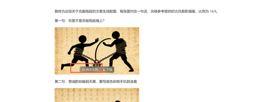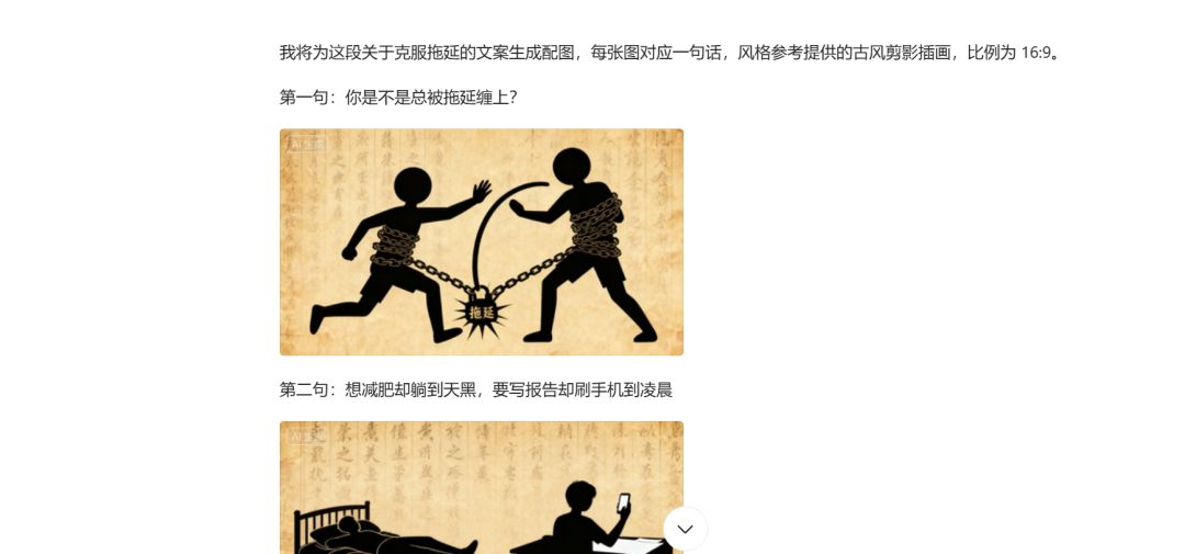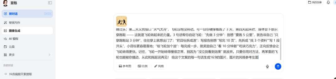 打开图像生成模式截图对标图片,输入提示词:xxx(代表文案),给这个文案的每一句话生成16:9的图片,图片的风格参考左图