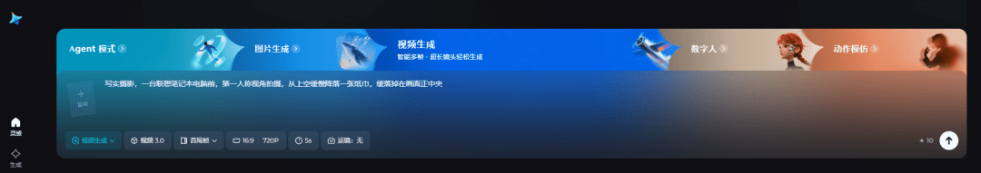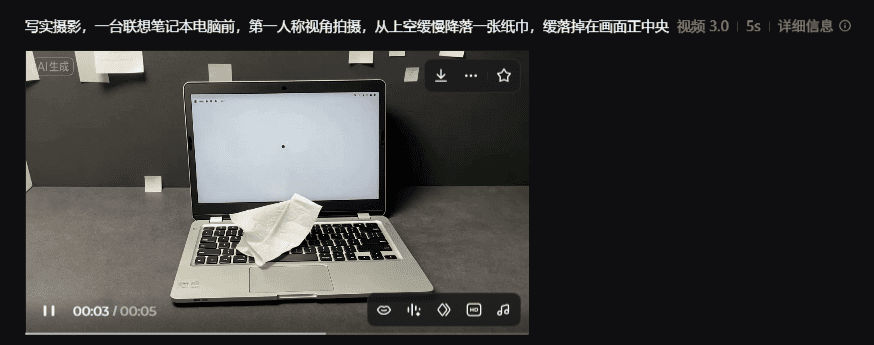 1.选择”视频生成”,输入提示词:写实摄影,一台联想笔记本电脑前,第一人称视角拍摄,从上空缓慢降落一张纸巾,缓落掉在画面正中央。