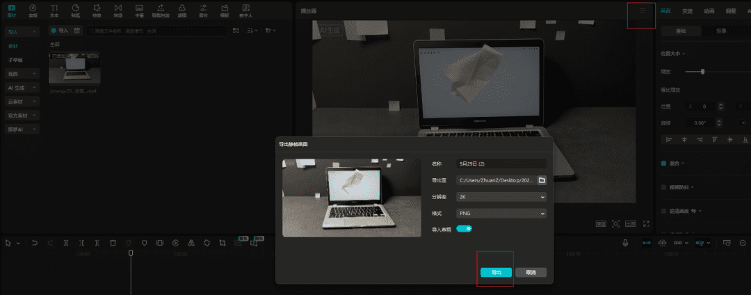 2.点击右上角菜单,选择”导出静帧画面”,保存这张图片,作为后续变形的基础帧。