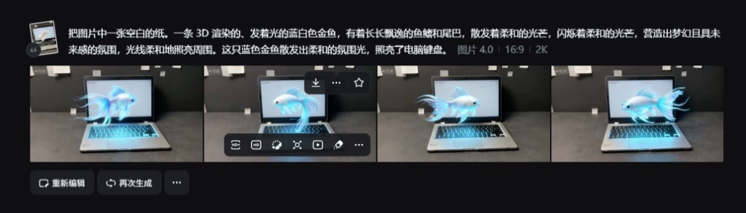 -输入提示词:把图片中一张空白的纸,变成一条3D渲染的、发着光的蓝白色金鱼,有着长长飘逸的鱼鳍和尾巴,散发着柔和的光芒,营造出梦幻且具未来感的氛围,光线柔和地照亮周围电脑键盘。
