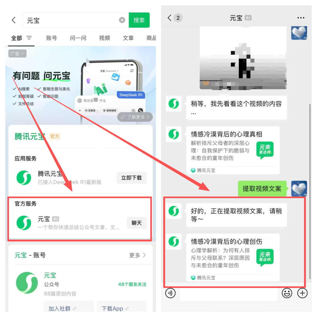 视频号提取文案,在微信里搜索元宝,增加为好友,然后把视频号的作品发给它,AI就会自动帮我们提取出文案。