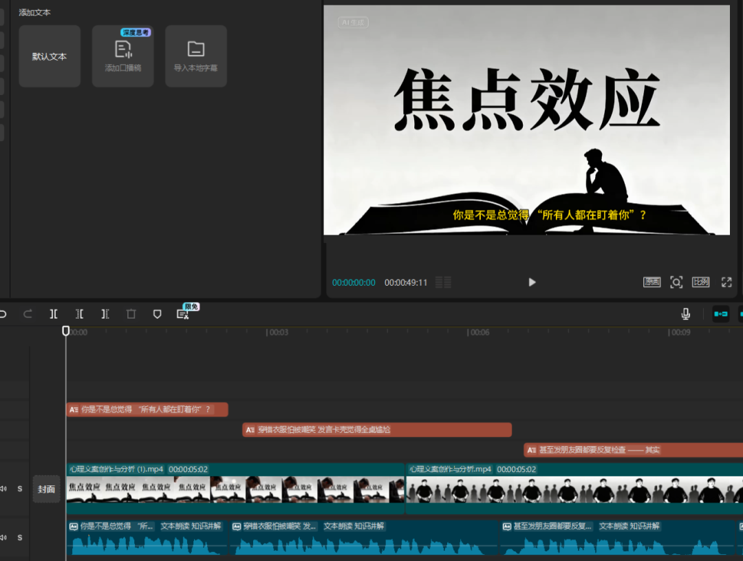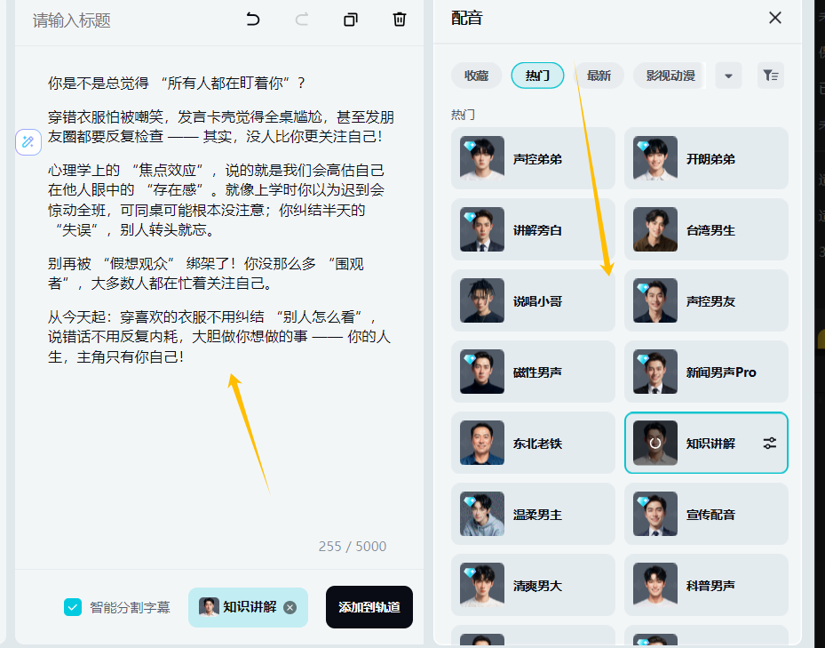 选择智能口播,把豆包生成的文案复制进去,然后选一个自己喜欢的音色配音,打开【智能分割】–添加到主轨道,
