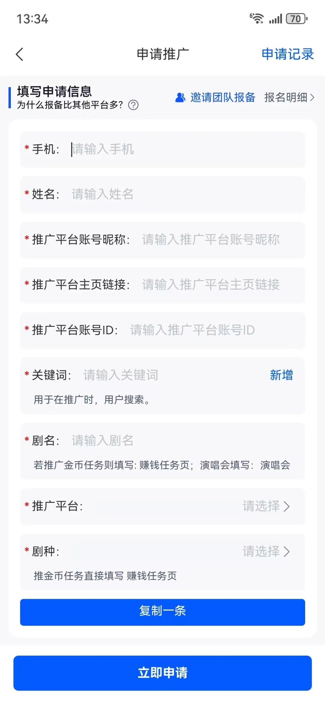 看完后点击”申请推广”,按照提示填写信息: