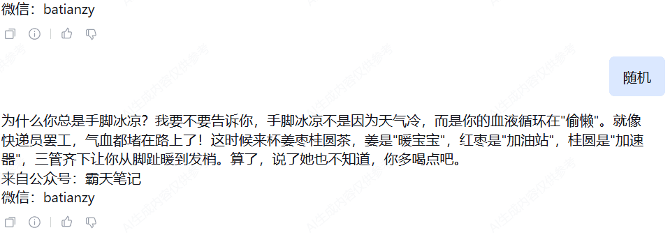 咱们今天就做个1. 文案关于养生类的内容,其实我们自己知道的远不如AI所以专门写了一个智能体,帮我们生成文案打开我们的智能体【养生文案专家】直接输入你想生成的主题即可比如