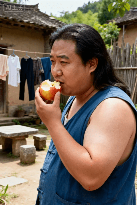2. 人物视频拍摄如果你能出镜是最好的,最好是打扮的普通一点,土一点也不用说话,就拿个东西吃两口,红薯,西红柿,苹果等等如果你实在不想自己出镜,那就用AI生成打开即梦AI,模型4.0,4k输入提示词:写实风格,高度逼真。近景,45度侧身,一位中年男子,留着长发,面部圆润,显胖,身穿老式蓝色大背心,手里拿着一根大葱,正准备吃。背景是80年代乡村场景,自己家的大院子PS:提示词自己随便写,重点是写实风格,高度逼真。选定一个人物形象后,后期的内容,只更改背景还有吃的东西就行了,人物主题的描述不高更改,这样人物就能高度一致了。