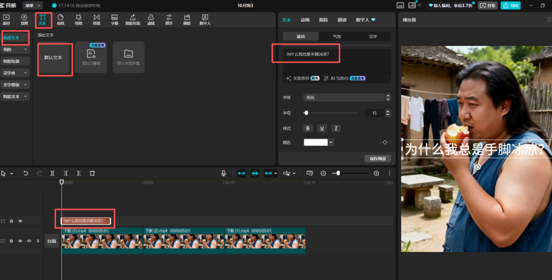 4. 视频合成将视频导入剪映里面同时新建文本,第一句话是个女孩说的,先给这段文字进行配音