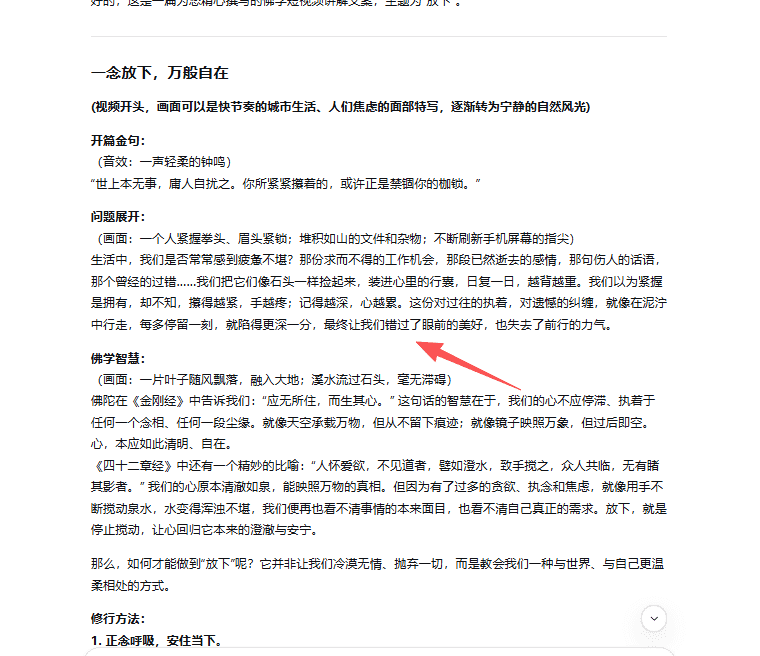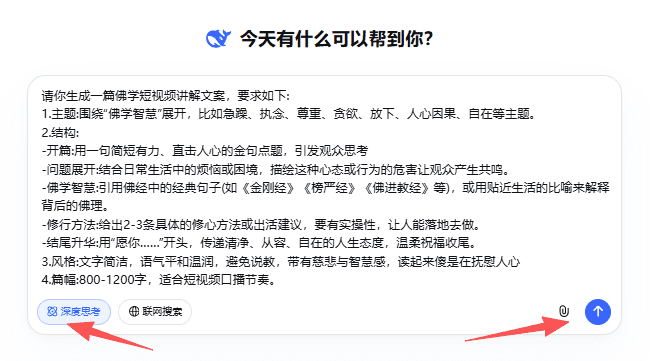 第一步,打开deepseek,打开深度思考,粘贴口令词口令词:请你生成一篇佛学短视频讲解文案,要求如下: