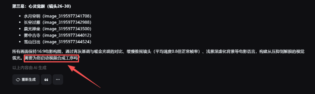 打开即梦,打开agent模式输入口令词:xxx(代表文案),请帮我给上面的文案设计生成30张分镜画面,画面风格是真实摄影效果,电影级别效果,具有佛学意境(比如:寺庙庭院,如僧人禅修,禅意场景,无人山水景色)元素,所有画面人物、场景保持一致性,比例 「16:9」